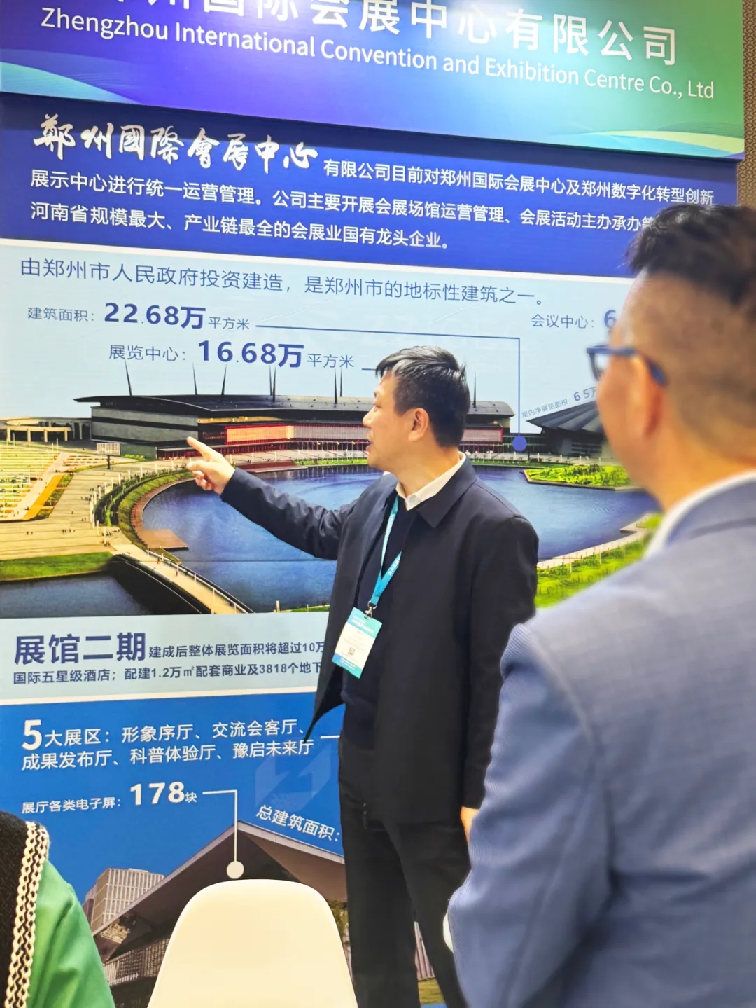 在持续一天的展览展示环节中,郑州国际会展中心有限公司党委副书记、董事、总经理揭开宇带领公司营销团队同与会嘉宾、参展代表及专业观众进行广泛沟通与对接洽谈,全面介绍展馆设施条件与运营能力,深入阐释郑州市会展政策与资源优势。论坛期间,我公司所制作的会展精品短视频在大会现场进行了展播,同时入选的优秀案例——“郑州数字化转型创新展示中心”被收录于主办方汇总印发的纸质版案例集,面向全体参会代表分发。